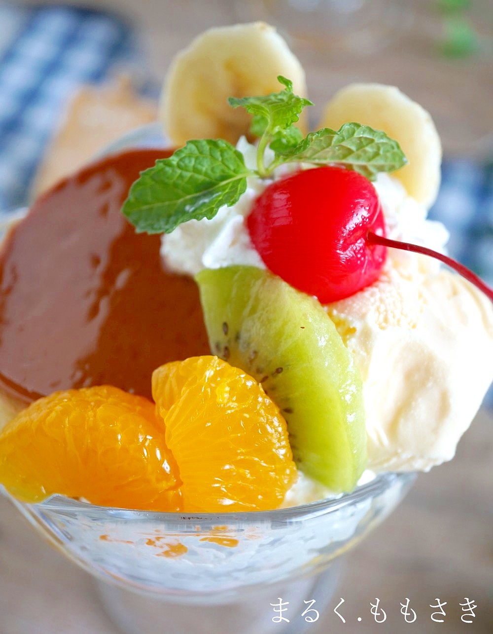 プリンを一旦皿に取り出してから詰める。カットしたバナナ・キウイ・ミカンの缶詰を乗せる。バニラアイスを乗せる場所がなくなったので大さじ1の計量スプーンですくって小さくアイスを詰め、生クリームを搾りさくらんぼ・ミントを乗せました。