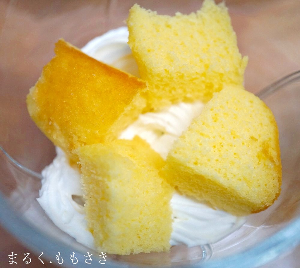バニラアイスを詰め生クリームを搾り、シフォンケーキをカットして詰める。