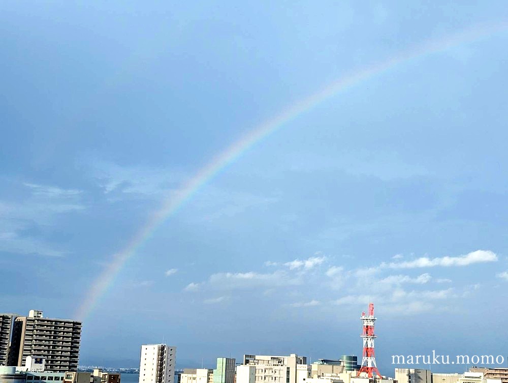 少しして窓を見ると虹が見事に1本通っていた!久々に半円の虹を見ました。