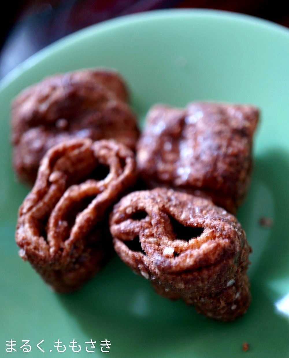 チョコをしみこませ砂糖をまぶしています。甘すぎず、サクサク食感が病みつき。ギンビズのしみチョココーンみたいなチョコでは無いけどまさにチュロスだ!!