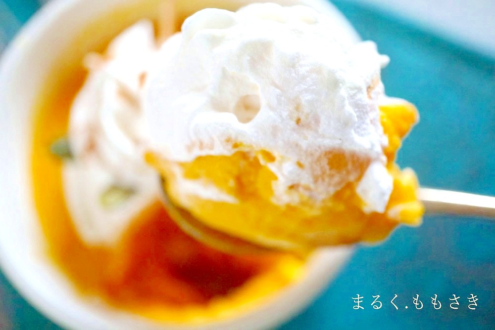 ふわふわホイップクリームと合いますね^^かぼちゃが濃厚な卵プリンです