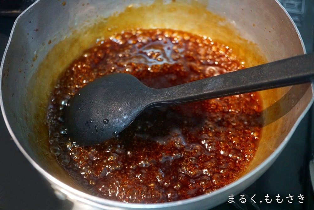 醤油・酒・みりん各大さじ1、砂糖・片栗粉各大さじ1/2 、水大さじ4を鍋に入れ混ぜながらフツフツしてとろみが付けば火を止める。