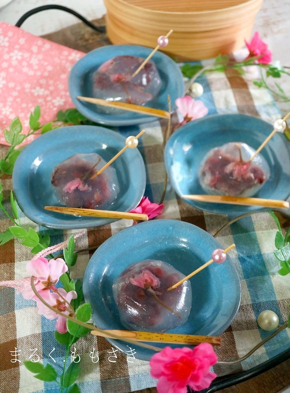 その桜の香りが大好きです^^昨年使った桜の塩漬けを冷凍していたので、それと缶詰のあんこ~ゆであずきを使って簡単に口当たりのいい、つるるん♪とした寒天ゼリーを作りました♪