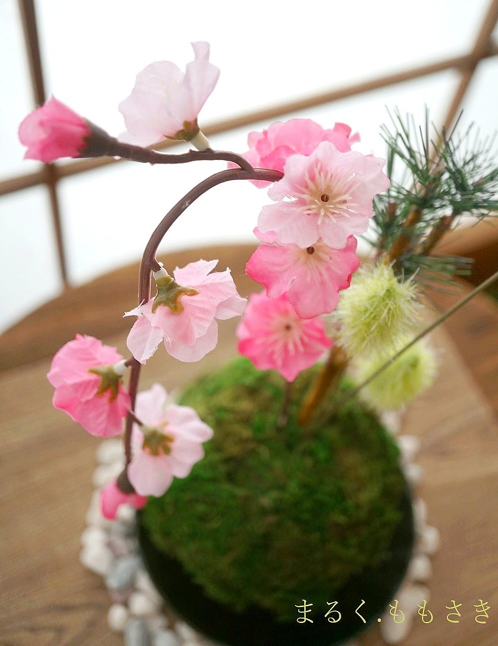 先ほどの苔玉に刺すだけ。※セリアで以前買った松の枝も刺しました。