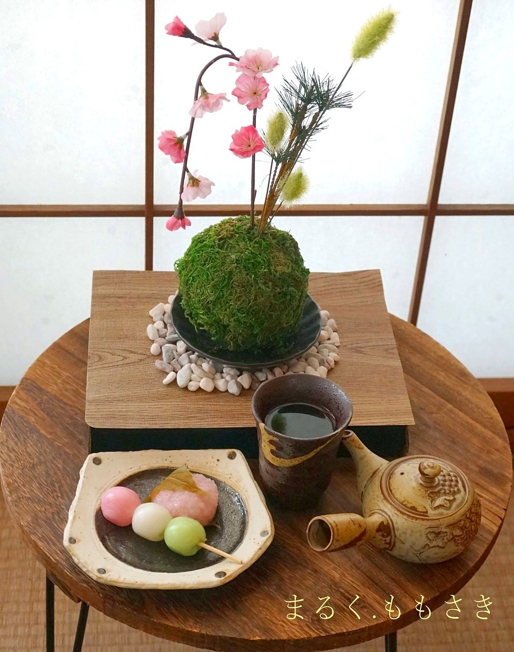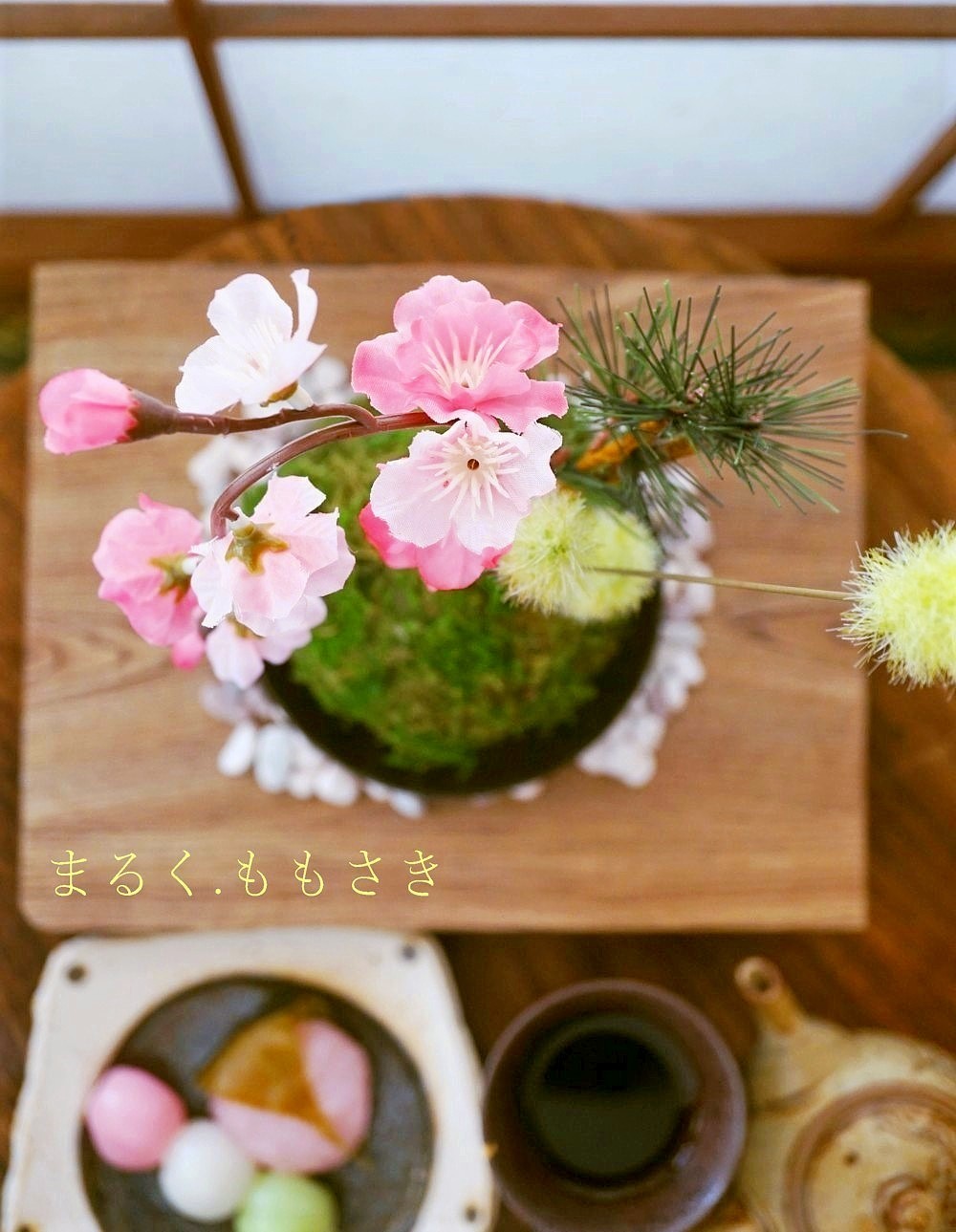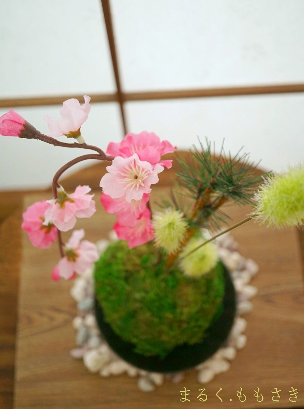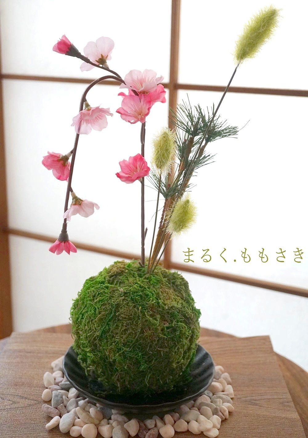 苔玉は給水スポンジで軽く、上に花が刺さっているので頭が重いから、お皿の底にセロテープを輪にして2枚苔玉の底を軽く付けています。これで安定しました♪