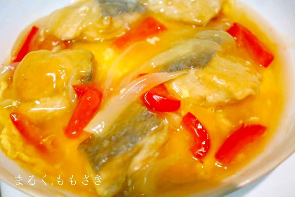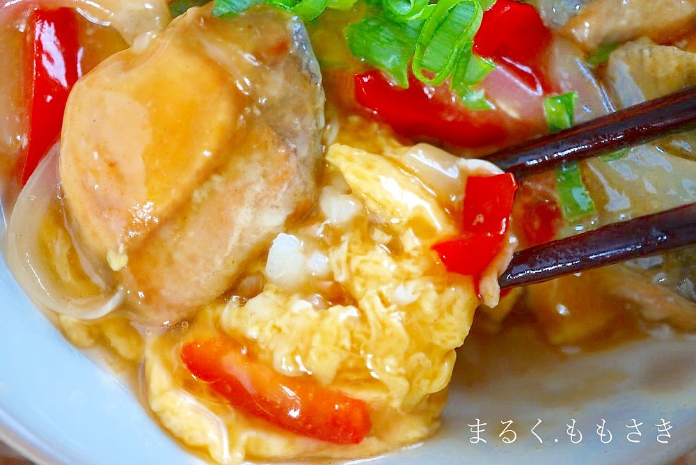 ふわふわ卵焼きの上に、とろとろ餡かけ~柔らかい鮭とパプリカ玉ねぎで具だくさんの天津飯です