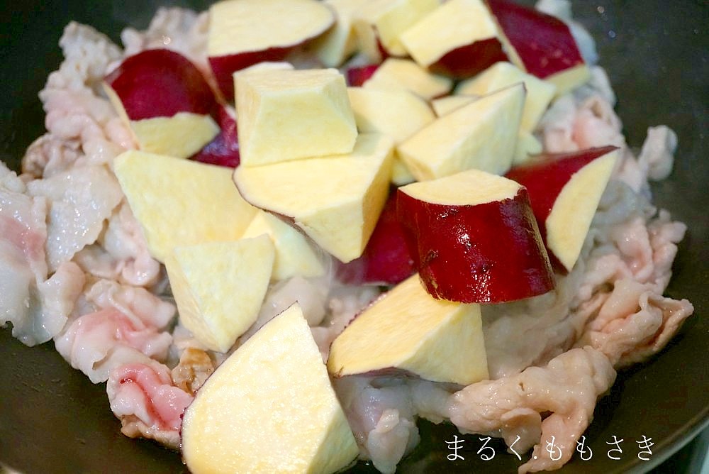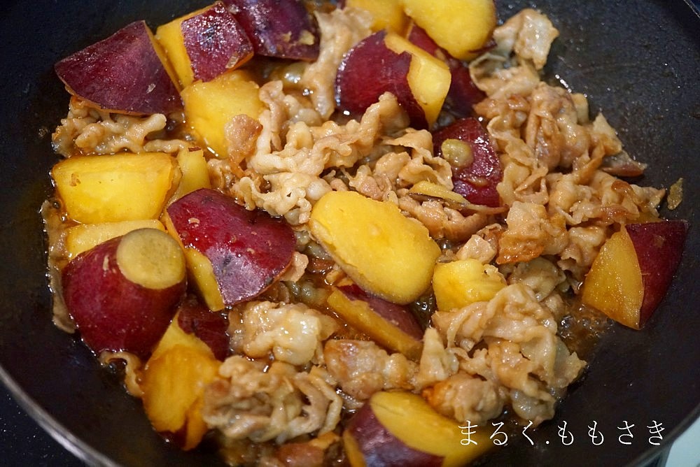 豚バラを炒めた油でさつま芋もさっと炒め煮るので、さつま芋をレンチンなどせず作れます。