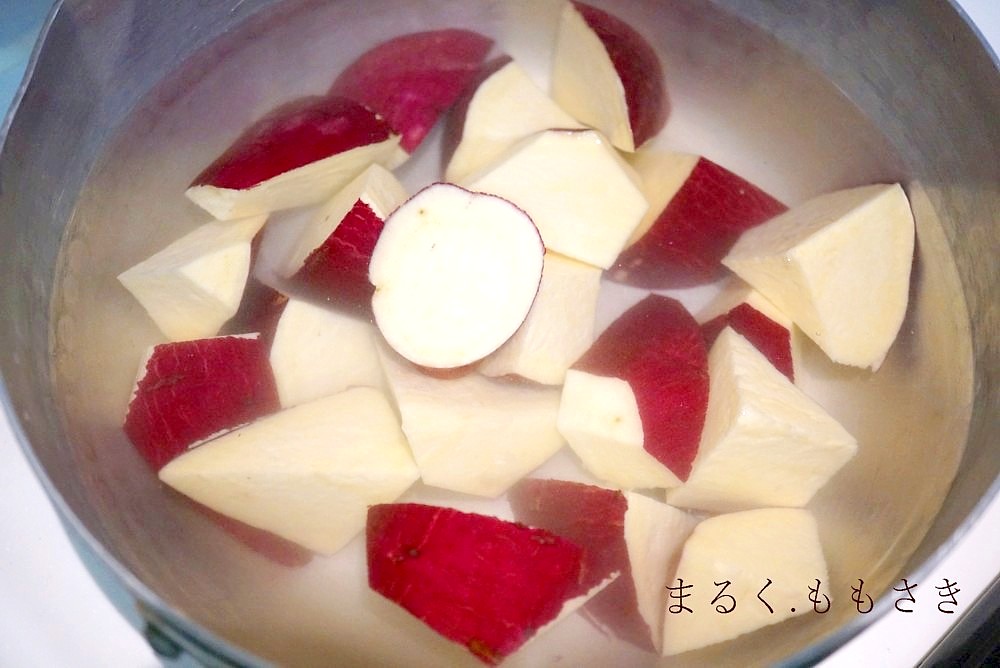 ●さつま芋は皮を綺麗に洗い3㎝ほどの乱切りにし、水に10分つけあく抜きをする。