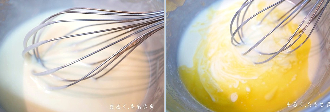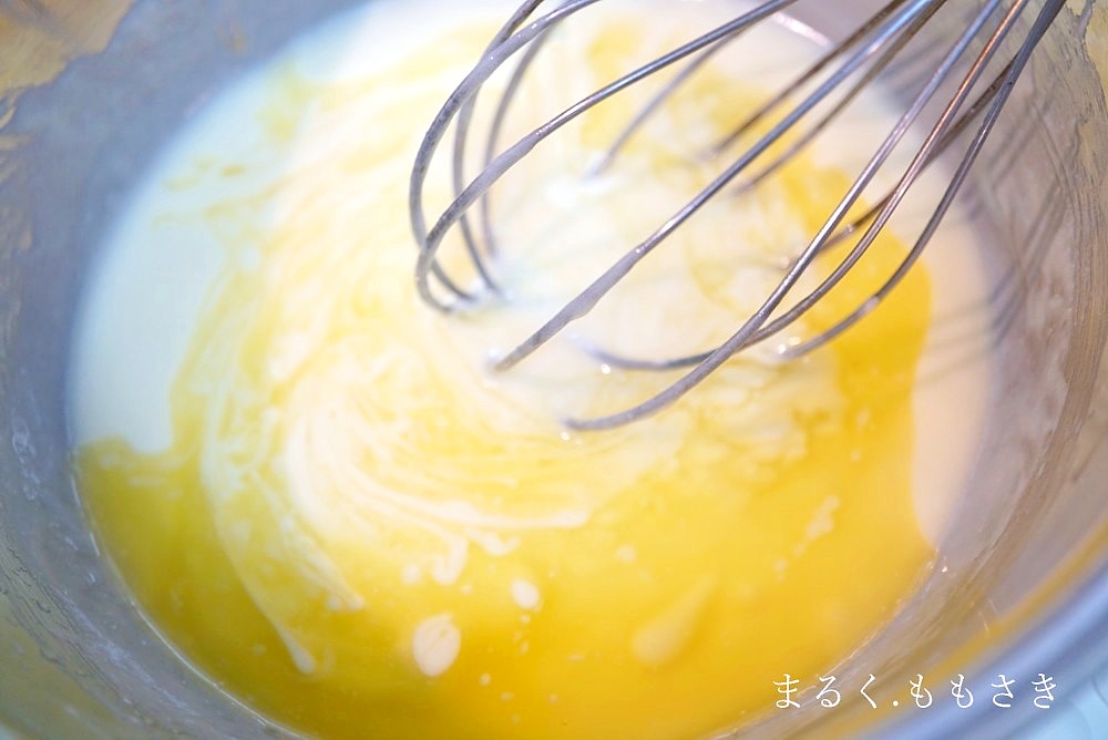 ここに水を入れ混ぜ~溶かしバターを入れ混ぜるだけ。サラダ油でもお好みで。