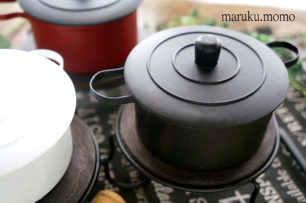 このような形です。私は3色の鍋を作ったので3個用意しましたがお好み数をご用意ください。