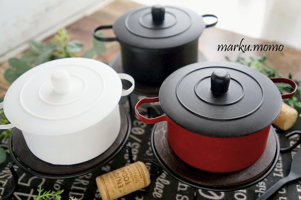 空き缶リメイク第3回は、キャンドゥーに行った時にコップのシリコンの蓋を見て、ストウブ鍋などの蓋に似ているなと思い、これと空き缶でココット鍋を作りました