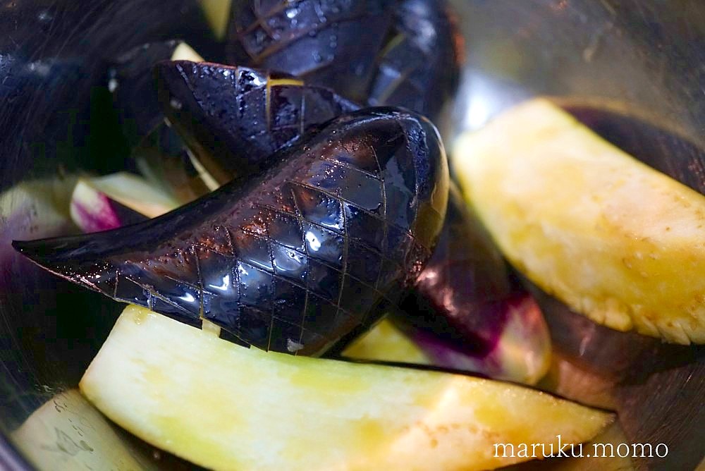 ●ナスはヘタを取り半分に切り皮に格子状に切り込みを入れ、さらに半分に切る。