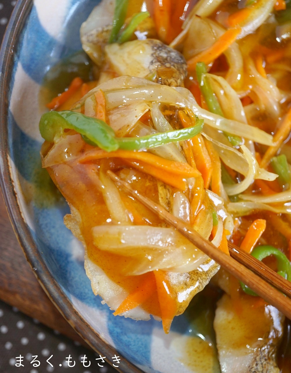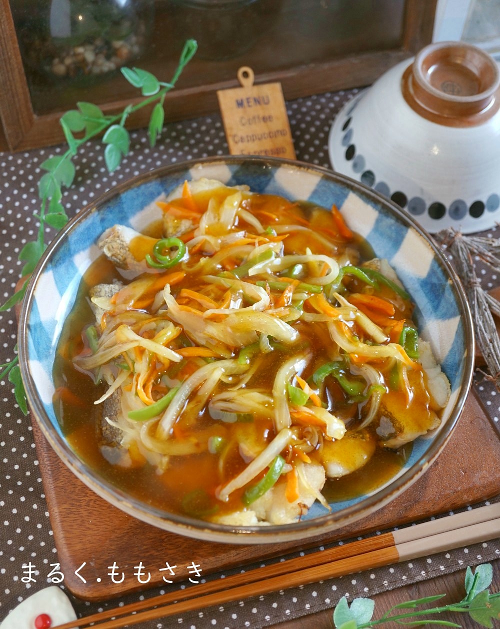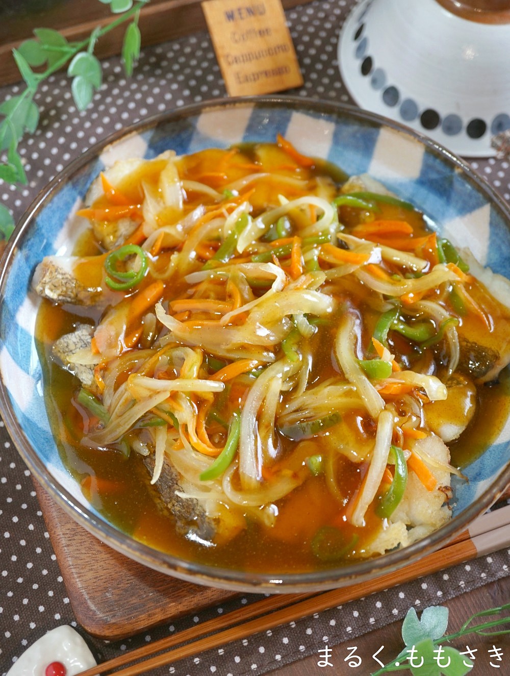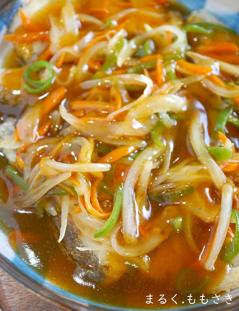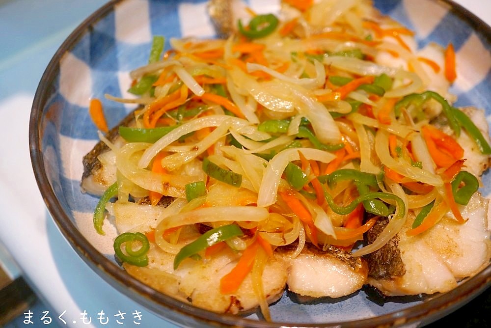 鱈はフライパンで焼き、野菜を刻んで炒め乗せ上から和風の餡をかけました。