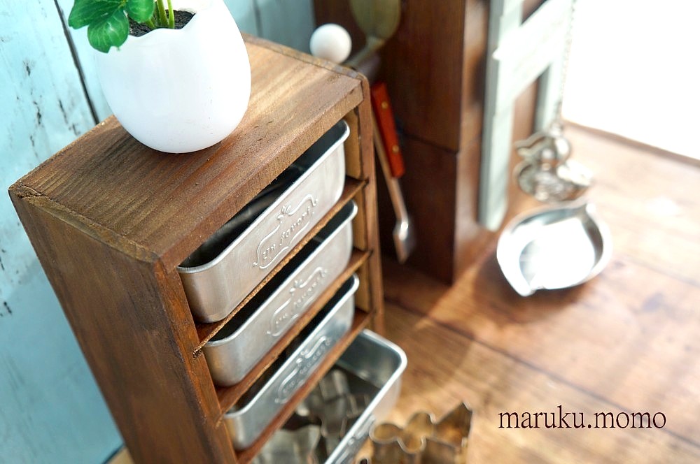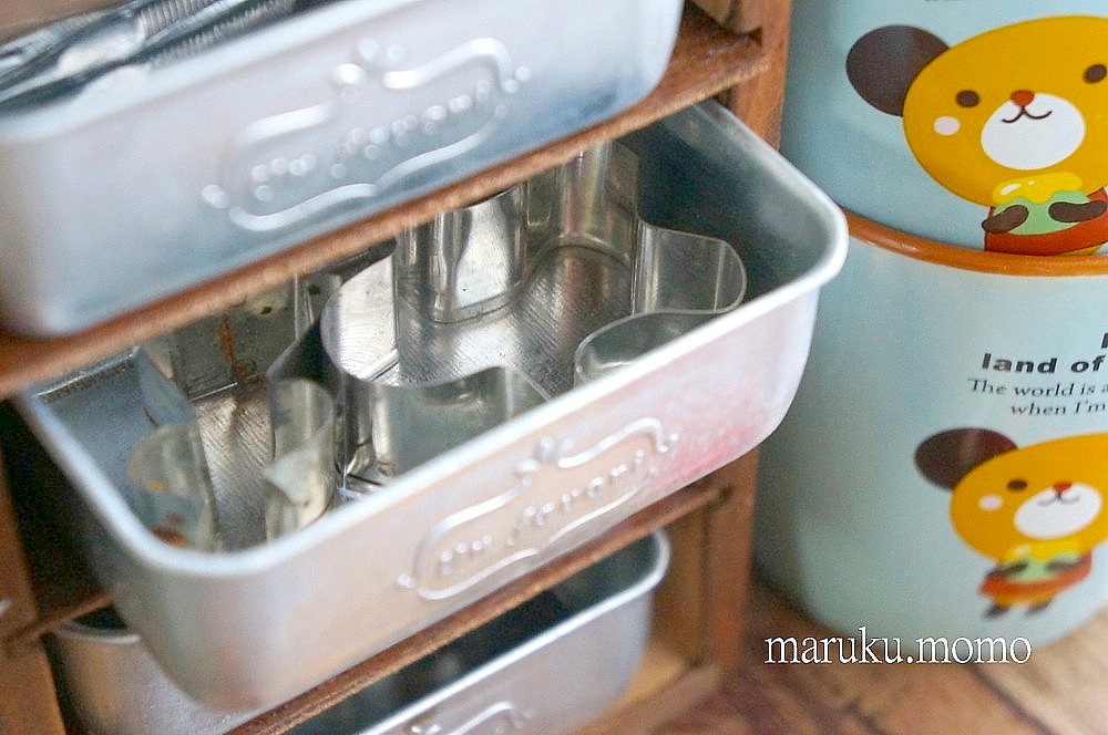 引き出しの中は、10年前くらいに集めたレトロなクッキー型です。少し錆びていますが~何だかこれを入れるのにいいかなと♪紅茶とクッキーって合いますものね