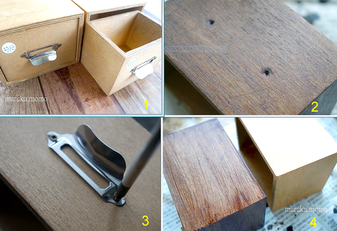 塗ったウッドボックスが乾けば、2個を蝶番で止めるだけ。初の蝶番です(笑)