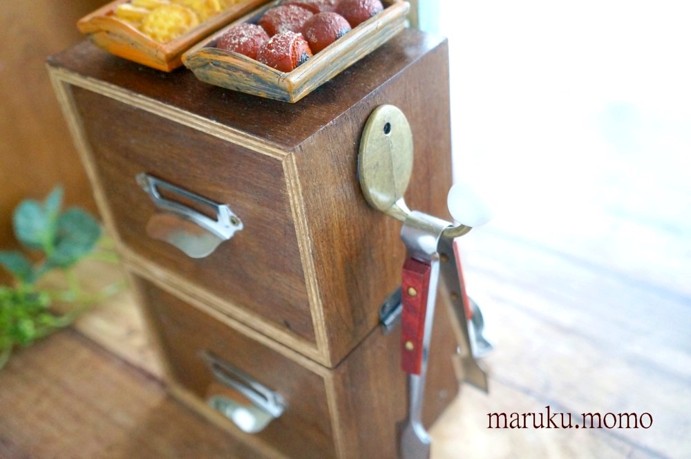 裏面の引き出しの中に、キャンドゥのミニ小瓶に茶葉と角砂糖とセットしました。ミニサイズの角砂糖スーパーで探しました(笑)茶葉をすくう、キャンディースプーンも後で見つけました、セリアだったと思います。名前はティーメジャーになっています。