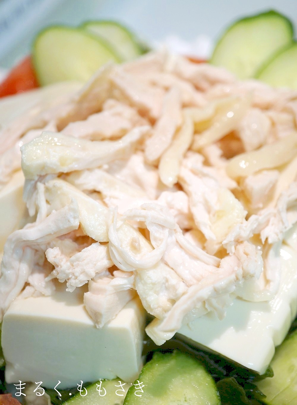 手で裂いたサラダチキンを上に乗せ、食べる時にドレッシングをかける。