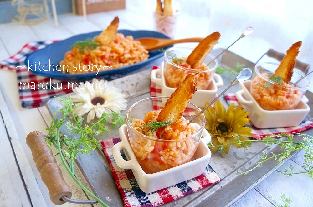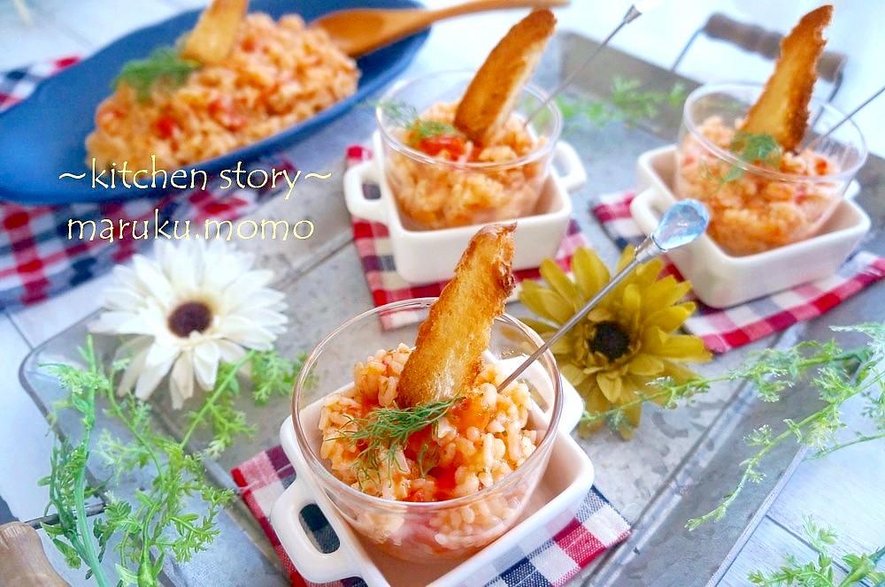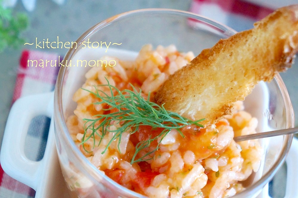 フライパンでさっと作れるトマトリゾットをガラスに盛り、カリカリに焼いたバケットを添え、お好みのハーブなどを飾ります。今回はディルを添えました。雨の影響でこれしか手に入らず💦ディルは大好きなんですが、バジルなども合うと思います