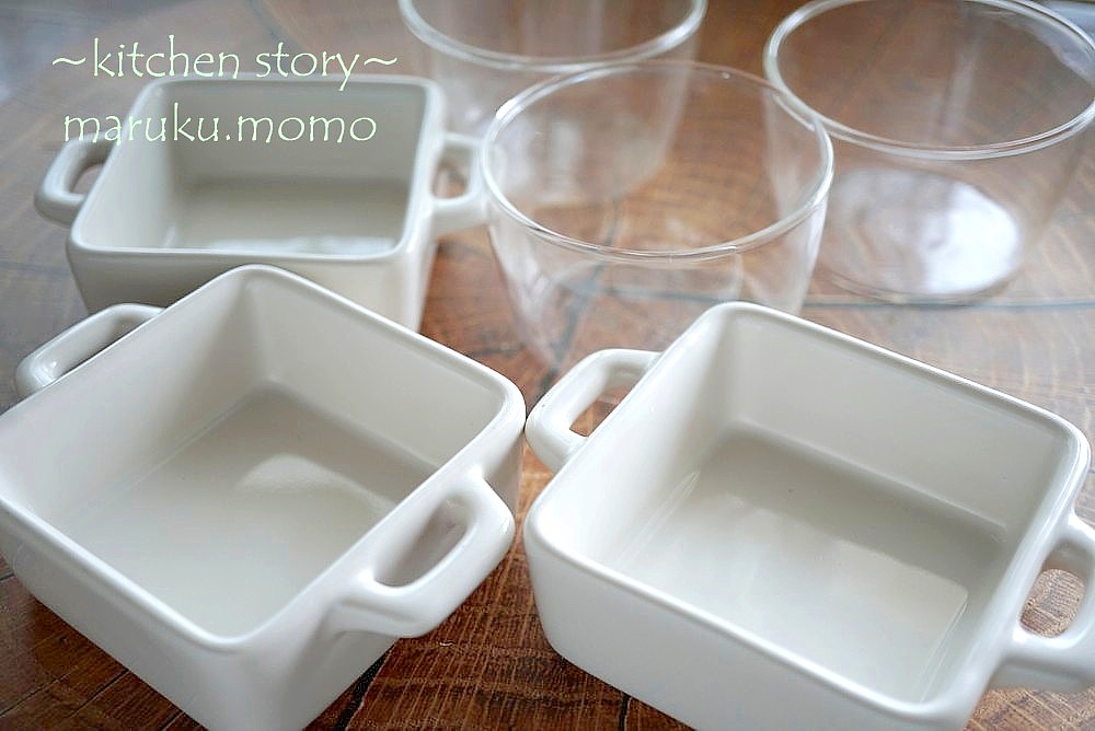 今回使ったのはセリアの持ち手つきの陶器とダイソーの耐熱ガラスです。こちら蒸しプリンなどにもよく使っています。どちらも1個108円この2つを重ねることで、グッとおもてなしの雰囲気になります