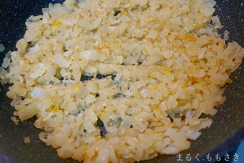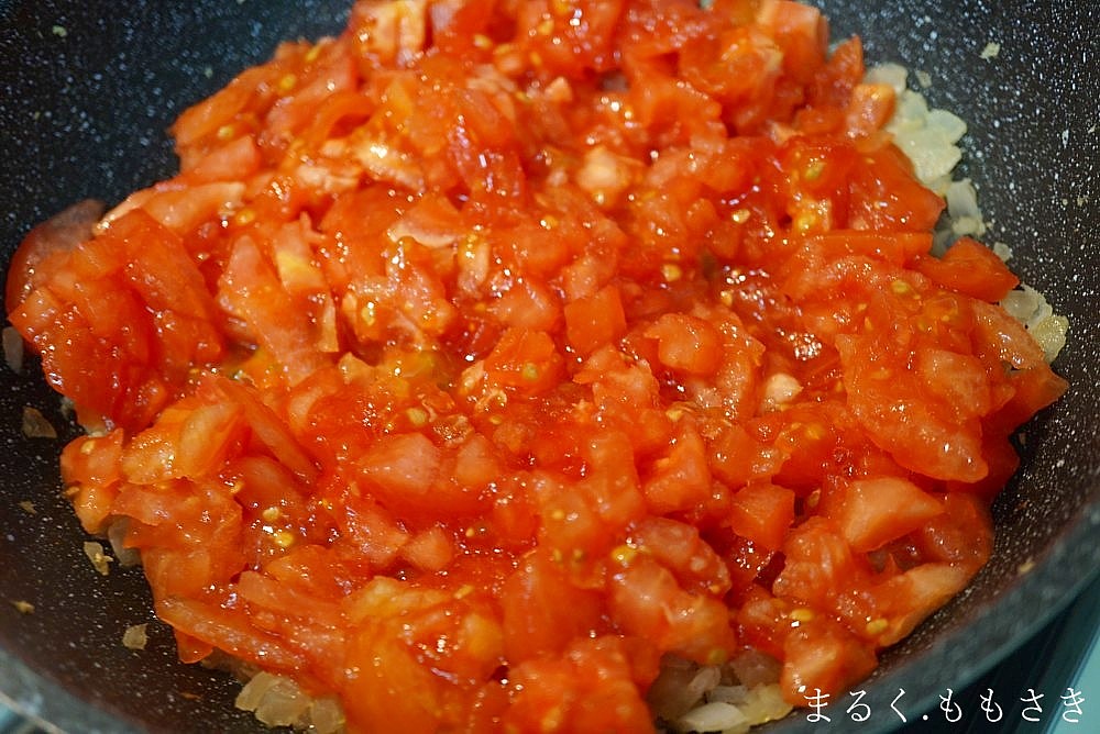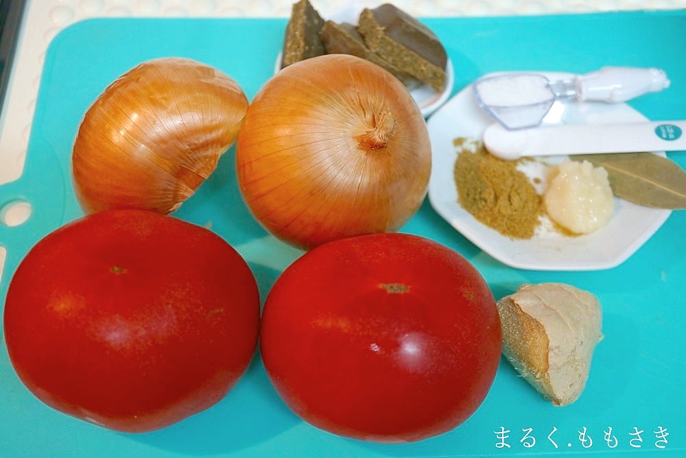 玉ねぎはみじん切りにし、トマトは皮を剥き1cmにカットする、生姜はする。