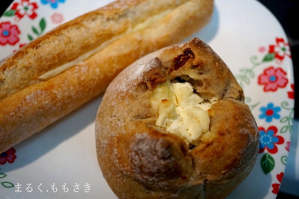 練乳クリーム入りのフランスパン、くるみとイチジクのクリームチーズカンパーニュ、パンの生地から小麦の香りがする!またクラストがパリパリでかみしめ系で美味しいなぁ