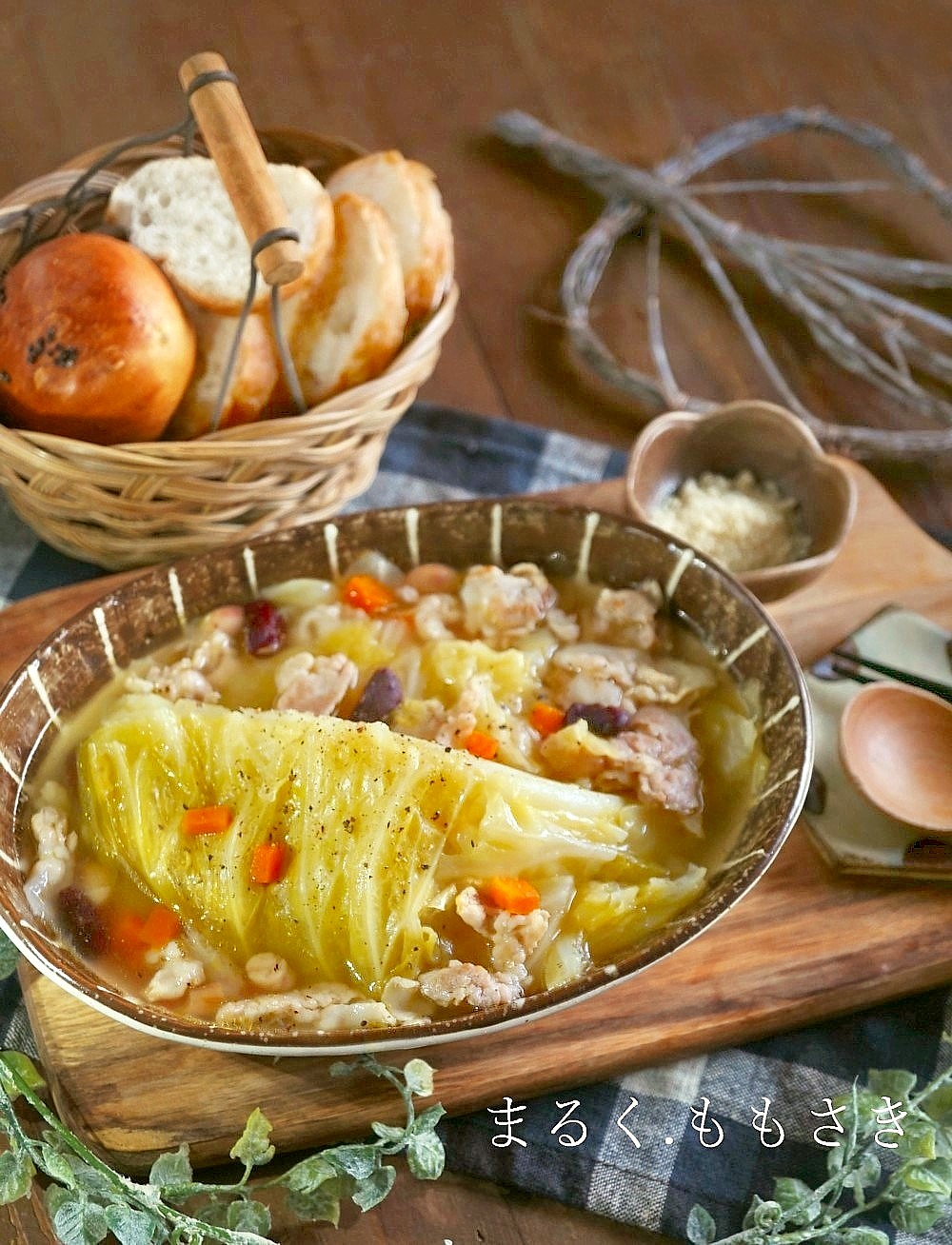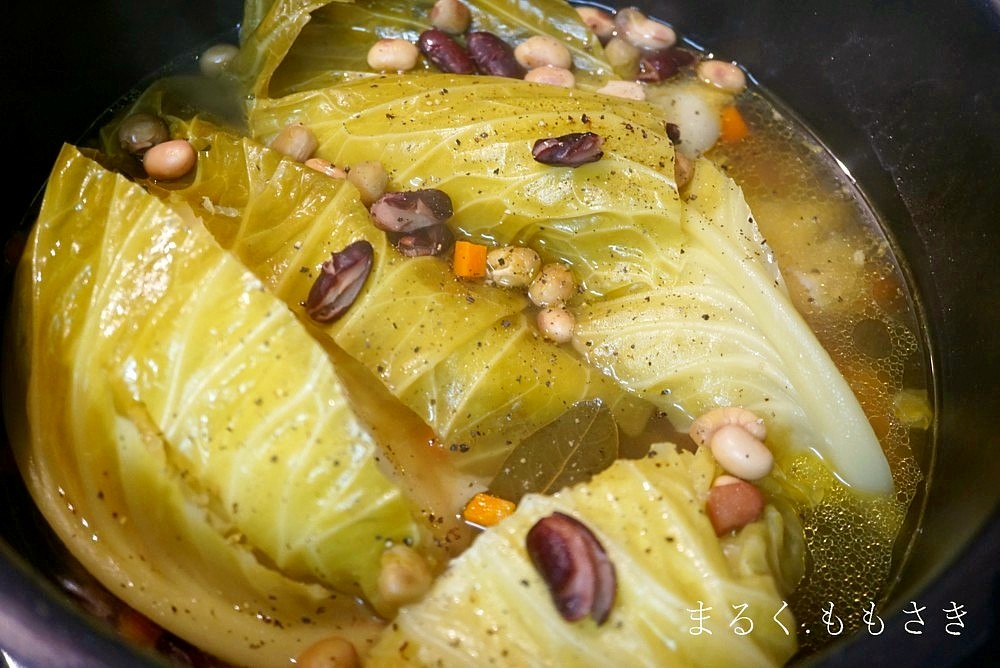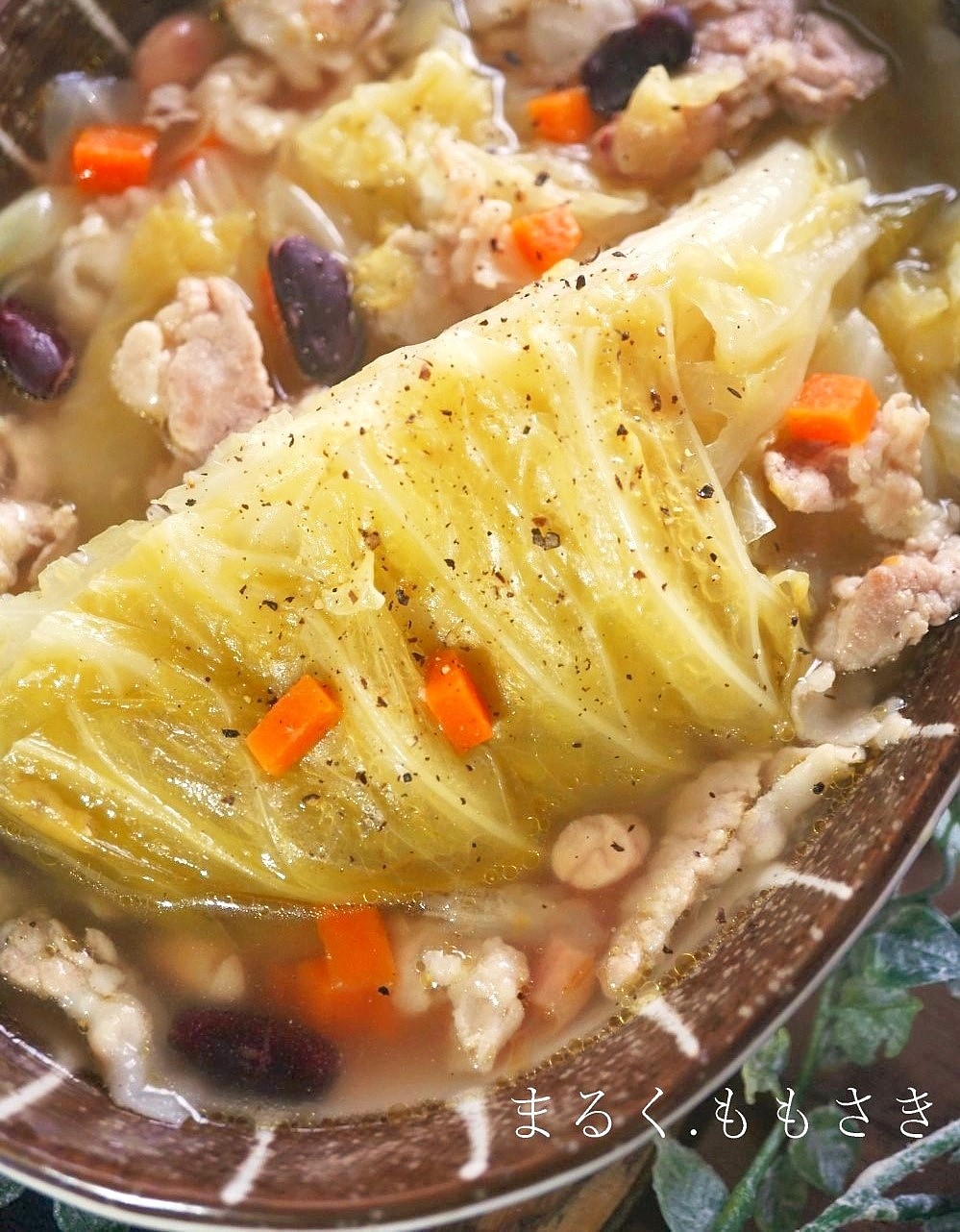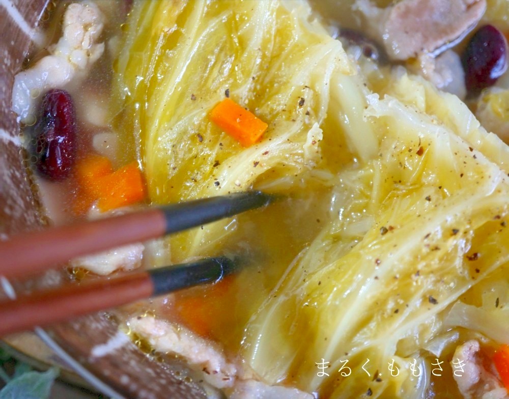 キャベツのスープの第2弾♪今回は豚肉とミックスビーンズを入れた食べるスープ。