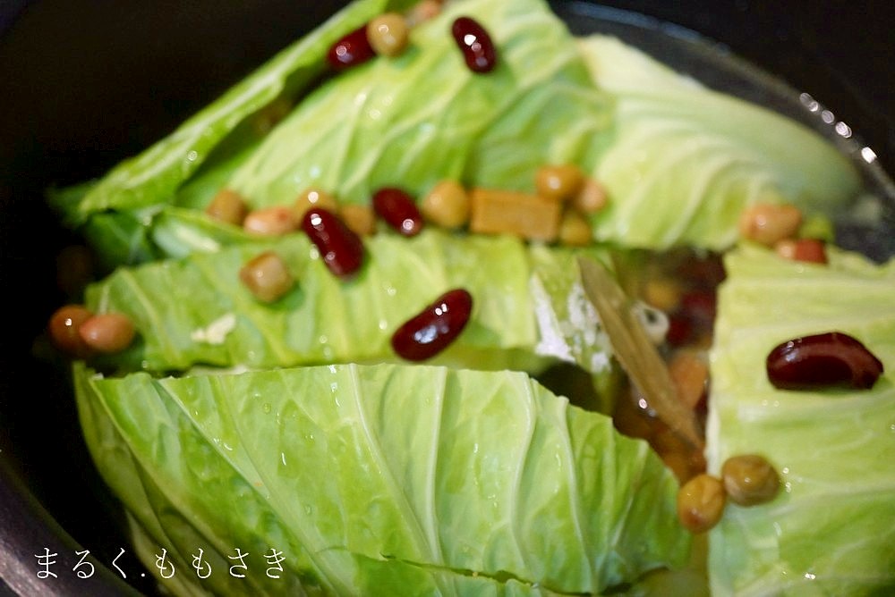 ●キャベツは芯を付けたまま6つに切り洗い、水気をしっかり切っておく。