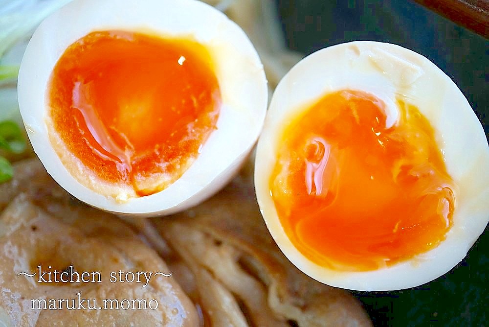 煮卵は卵の底を少しヒビを入れ、酢を少し入れた湯の中に卵を入れ、沸騰2分半火を止め、蓋をして3分。水につけ何度か水を変え、殻を剥き麺つゆ、みりん、しょうゆを適当に袋に入れ空気を抜き半日ほどつけています。