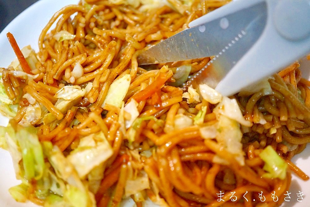 ブログ初期に焼きそばパンを作っていた時に、友達に教えて貰ったのが、焼きそばをカットしてから詰めるそうです。こうしたらパンに詰めやすい!私はハサミで何度か切りました。そしてこれ食べやすいです^^