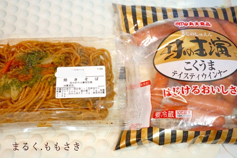 この焼きそば250g入りで100円。右は家にあったウィンナー。
