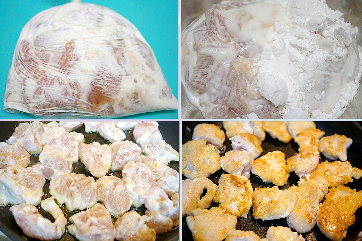 タンドリーチキンは、ヨーグルトに漬けこんで焼くので、ヨーグルトとチキンは相性がいいのでと思い、カレー粉など入れずにシンプルにヨーグルト漬けにしました。ヨーグルトはたっぷり使い、漬けソースごと焼きたいので、焼く前に片栗粉を入れます。そうしたら全体にヨーグルトソースがまとわりつき~無駄なく使えました