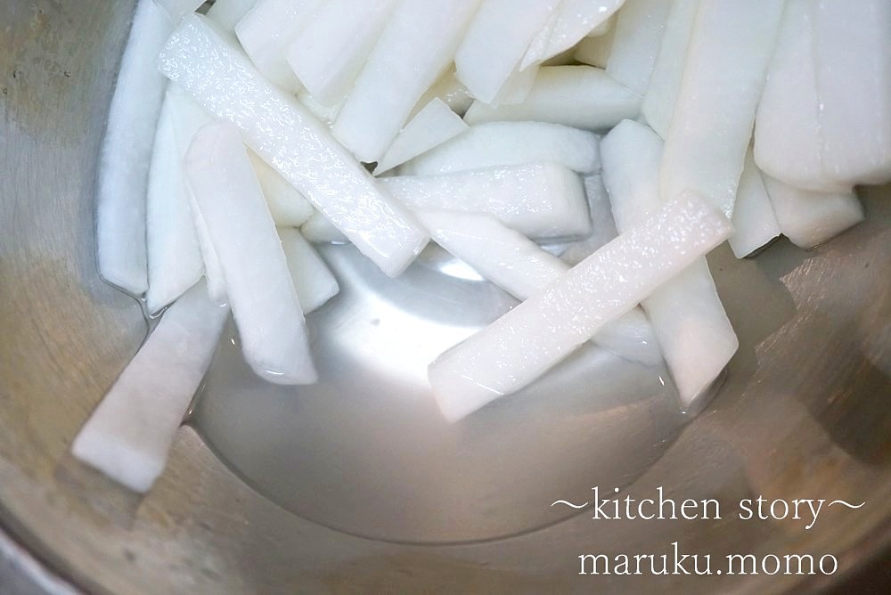 普通のお漬物を作る時は重さ2%の塩分で作りますが、大根を太めに切っているので3%で丁度でした。水分も早く抜け丁度いい食感!!